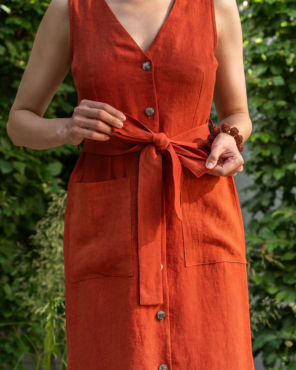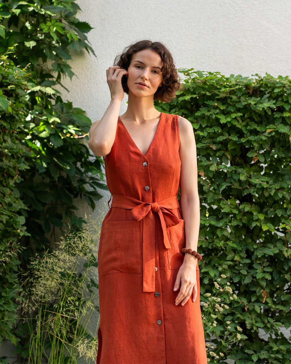 Linen dress Sierra features shell buttoned front, delicate V-neck, and charming front pockets. Midi-length dress is the perfect choice for a safari outfit made from 100% natural Linen fabric, dress features breathability that helps to wick away moisture from your body, preventing that sticky and uncomfortable feeling.