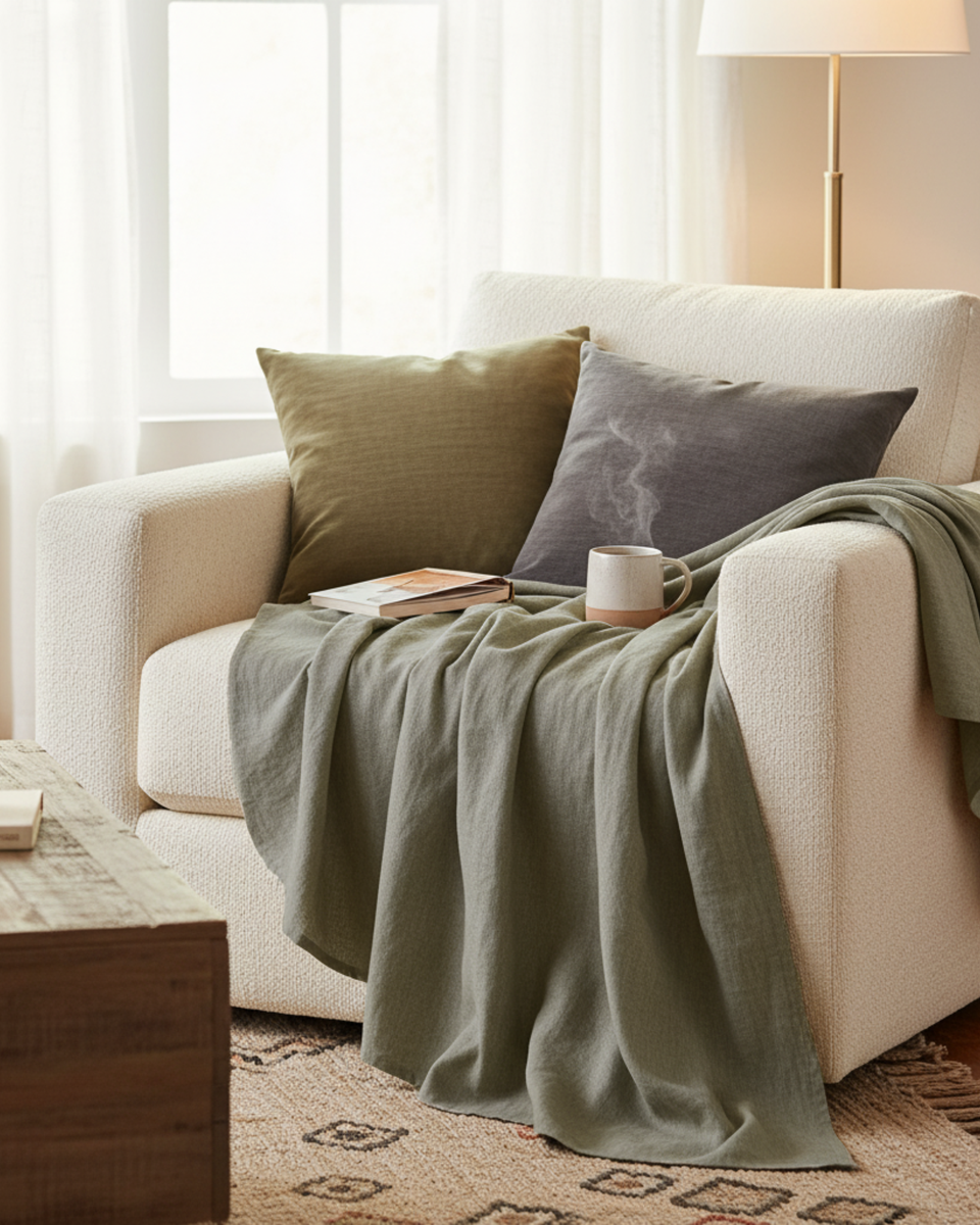 Improve your home comfort with our Linen throw blanket. Crafted from 100% organic Linen, our blanket is your go-to solution for year-round comfort. Whether it's a chilly winter evening or a breezy summer night, our breathable Linen throw has you covered. The natural breathability of Linen ensures that you stay comfortable without feeling too hot or too cold. Its soft, luxurious texture is gentle on your skin, making it perfect for curling up with a cup of tea, adding an extra layer to your bed, or improving your sofa's aesthetics.
