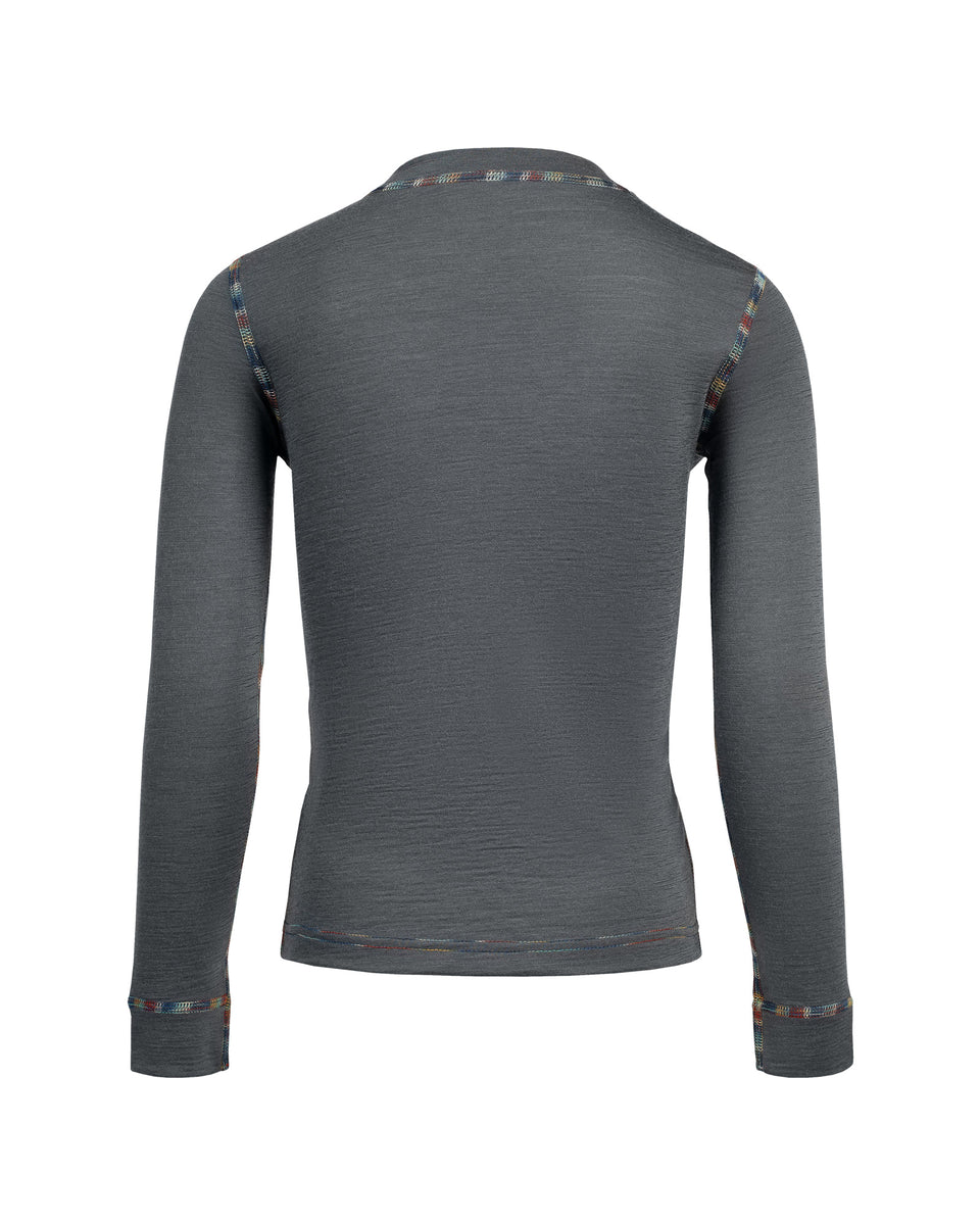 Knitted with care from lightweight Merino wool, this playful grey kids’ long sleeve top with cheerful contrast seams is ready for every adventure! Made from 100% natural Merino wool, the pullover feels gentle on delicate skin, stretches where needed, and naturally protects against bacteria. Hypoallergenic and safe, Merino top is a smart choice for parents who want both comfort and peace of mind. Super soft and never itchy, kids' shirt keeps little explorers comfy all day long – no overheating, no fuss, just happy movement. The breathable, moisture-wicking fabric works hard so kids can keep playing without feeling damp or uncomfortable. The modern grey shade, highlighted with colorful seams, adds a fun twist to every outfit – practical, stylish, and adventure-proof!