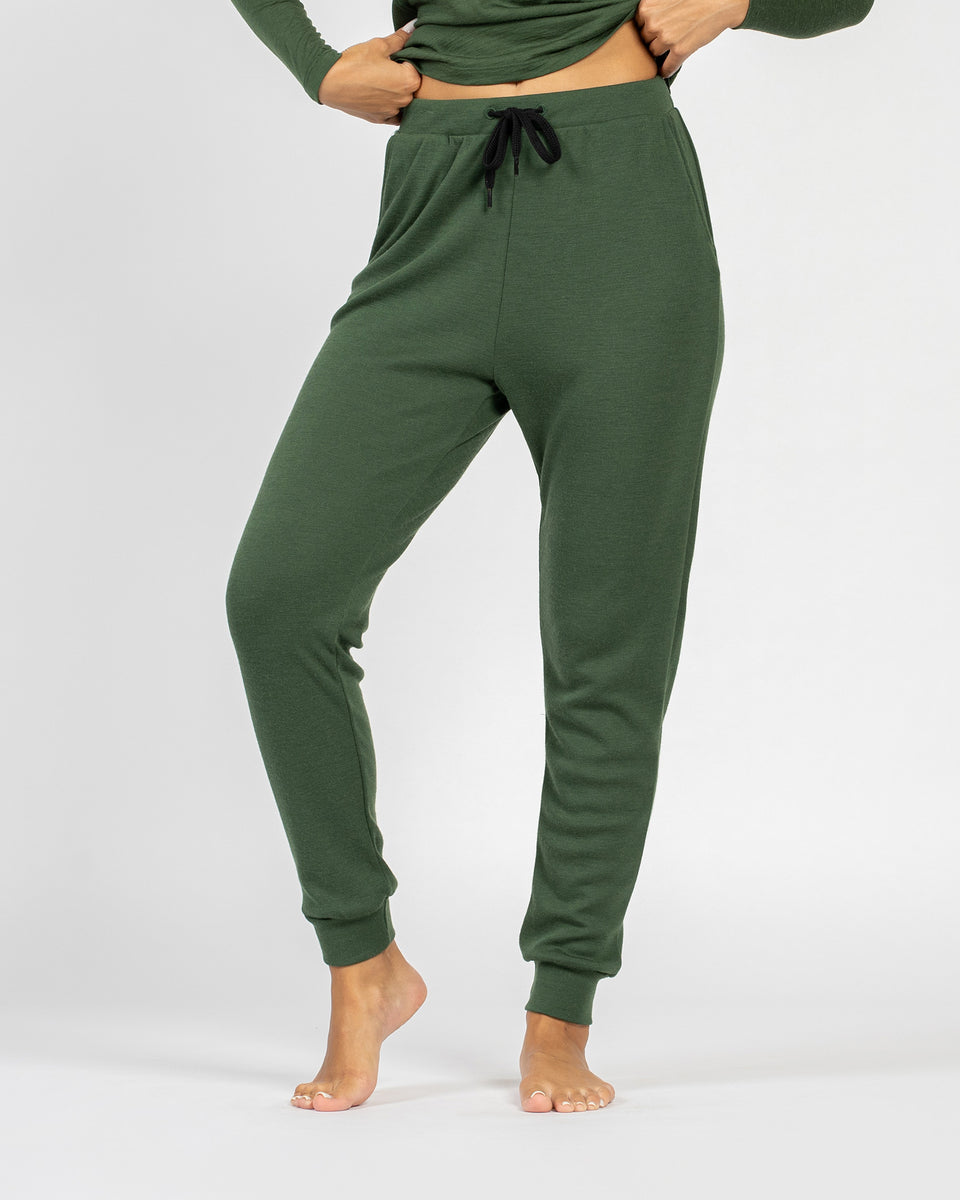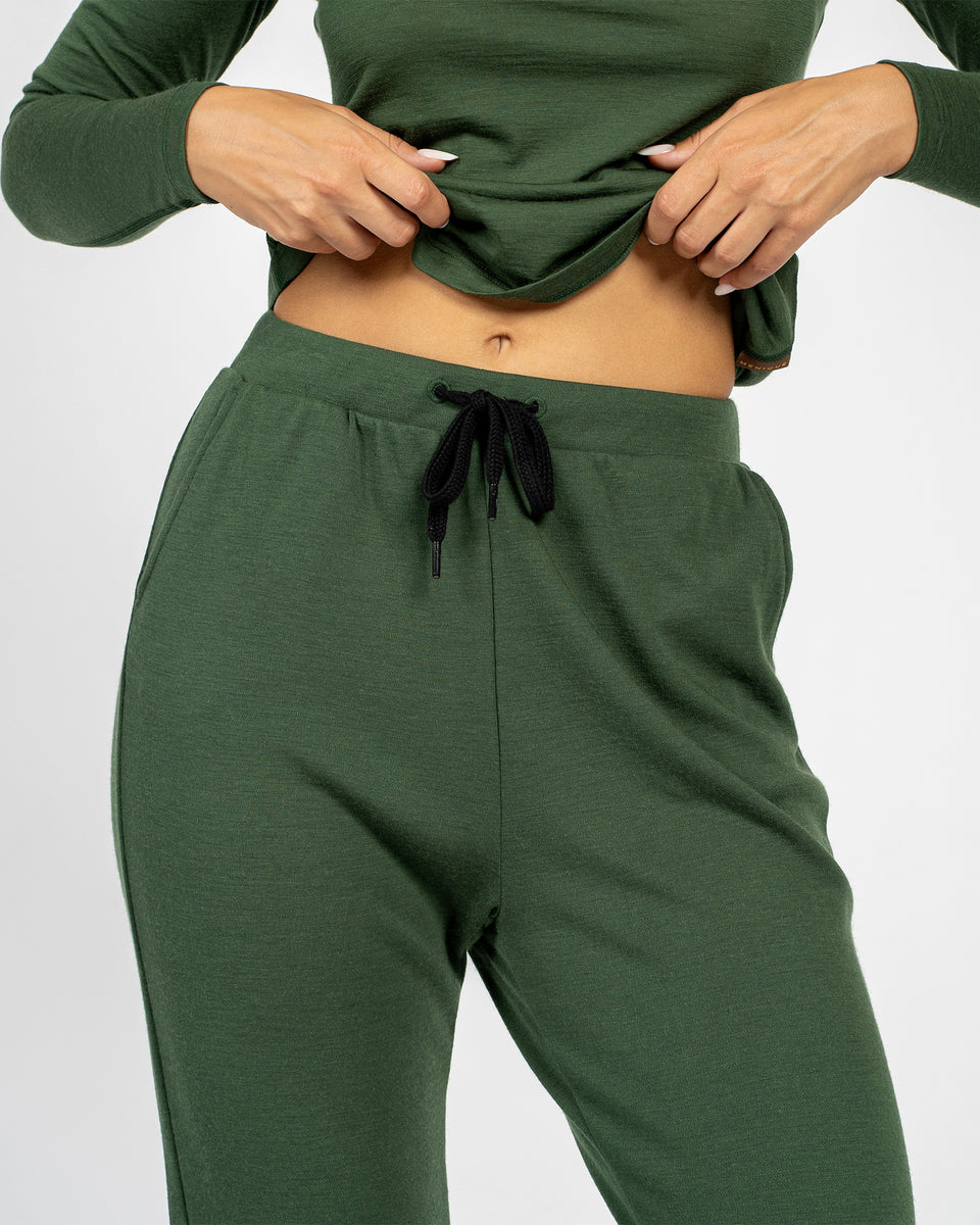 You are not alone in the search for comfortable sweatpants, and we have just the thing: jogger sweatpants designed for women that effortlessly blend simplicity with quality. Crafted from 100% Merino wool, these joggers gently hug your skin with softness and warmth, shielding you from the cold. With a midweight of 250gsm, they remain quick-drying and breathable, ensuring you won’t be waiting long to wear them again. And trust me, you’ll want to, as their durability means they’ll be a wardrobe staple for more than just one season. As for the color... Whether it’s yoga, hitting the gym, or simply lounging, the dark green hue is a perfect fit for any occasion. So, take on every challenge with confidence in these dark green jogger sweatpants.