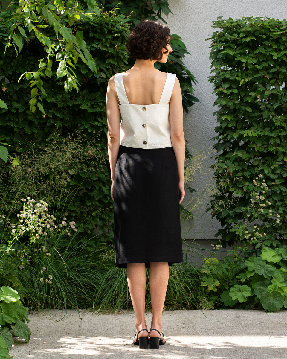 100% Linen crop top is crafted from double 200gsm fabric for a stiffer appearance. Featuring a sleeveless design and square neckline, it's ideal for showcasing your shoulders and enjoying the sun. The straight silhouette flatters your figure, and the button closure at the back adds more uniqueness.