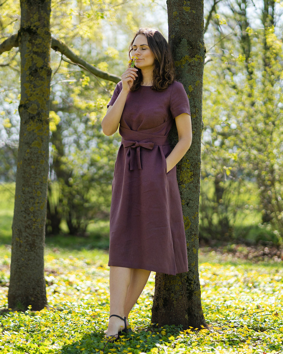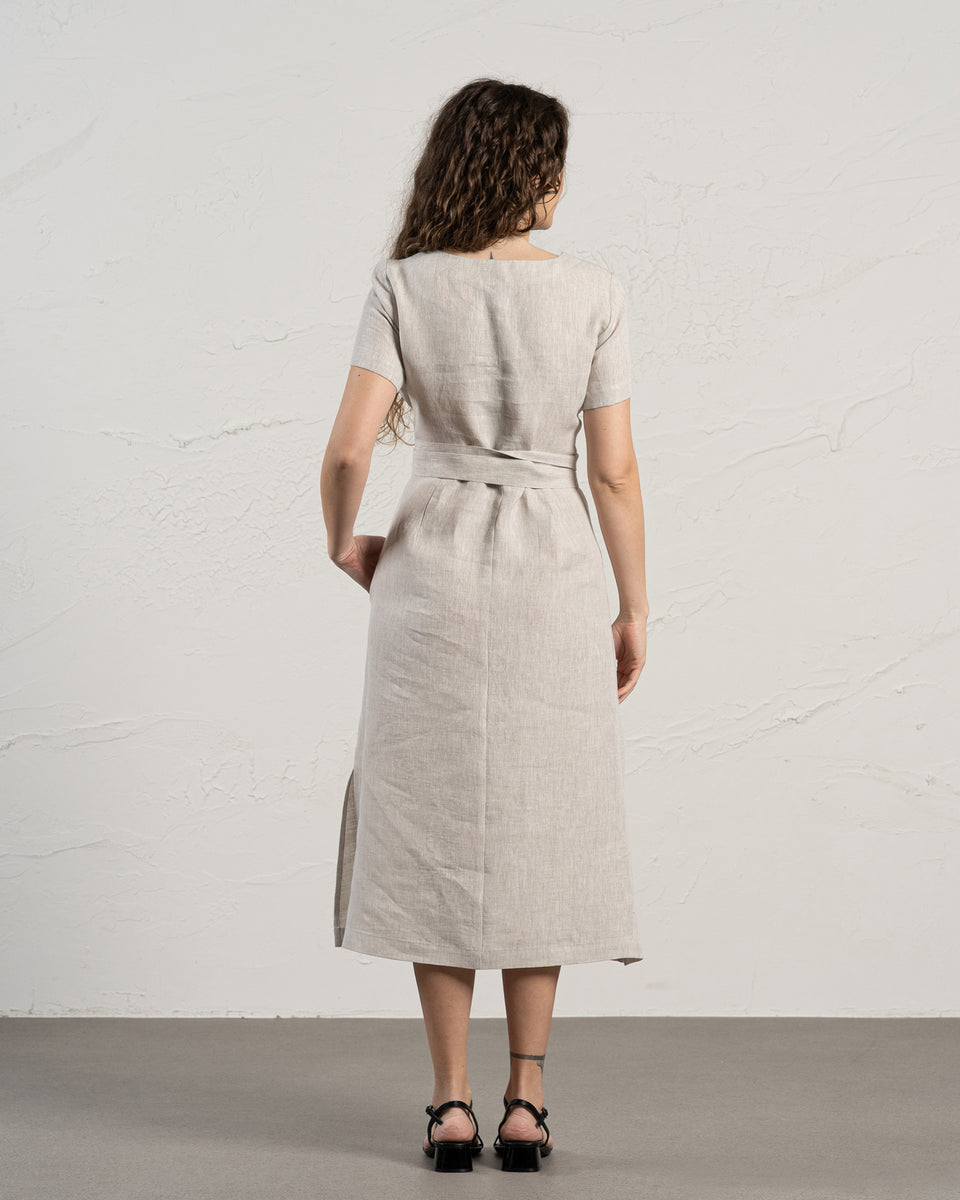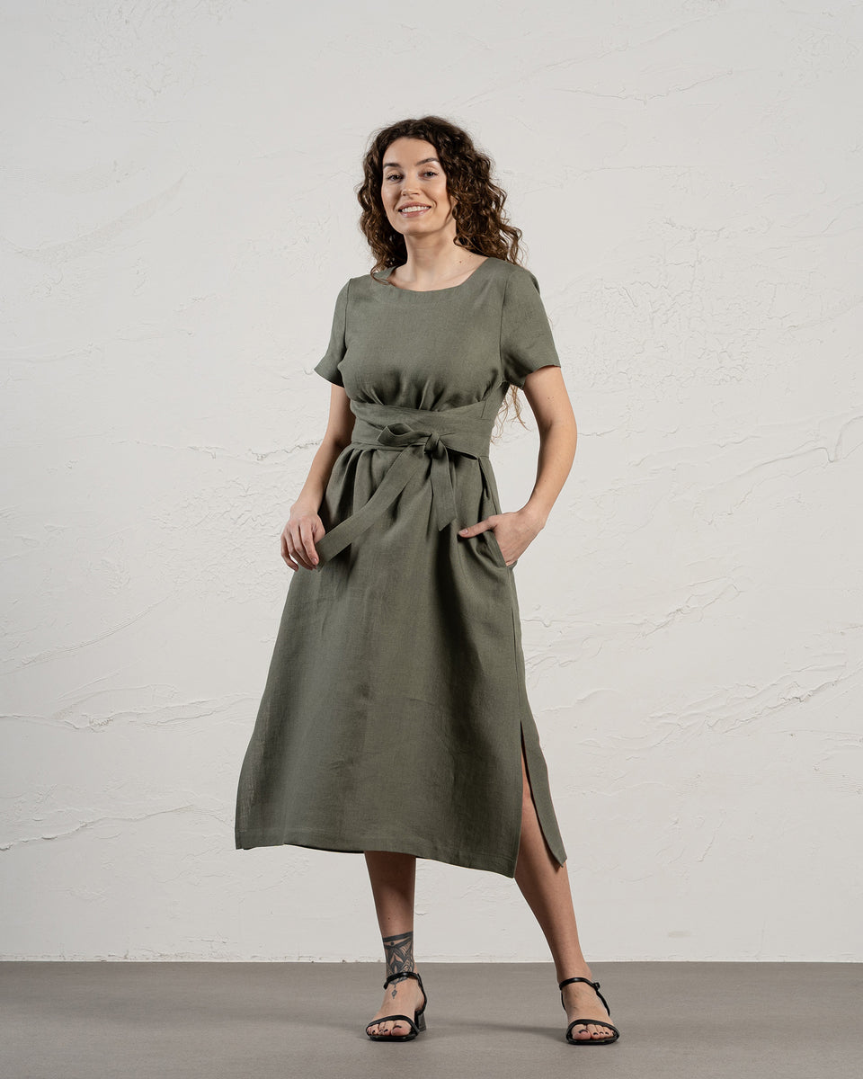Comfortable and organic summer dress for women features unique obi belt that beautifully wraps around and hugs the smallest part of the waist. The wide waist tie beautifully defines your waist, making this Linen dress perfect for every body shape. Midi length summer dress features two side pockets and elegant side slit details that give a finished figure-flattering look.