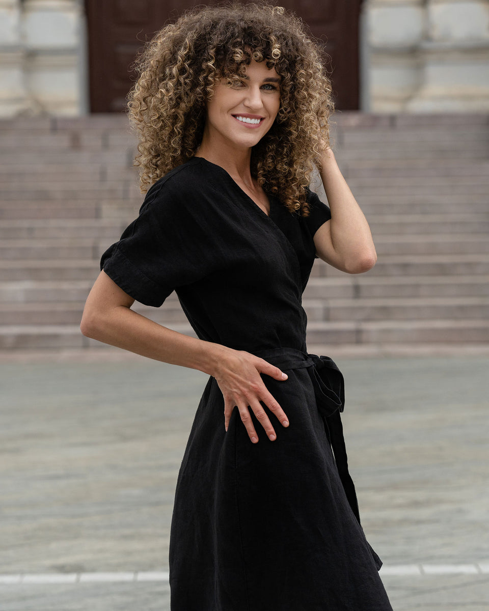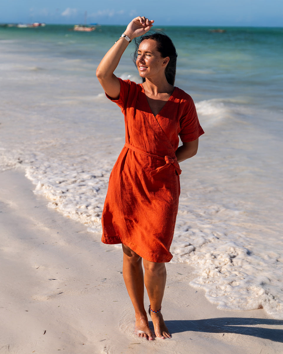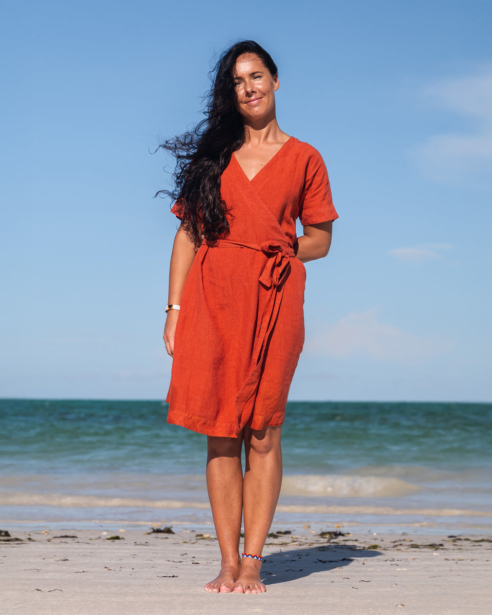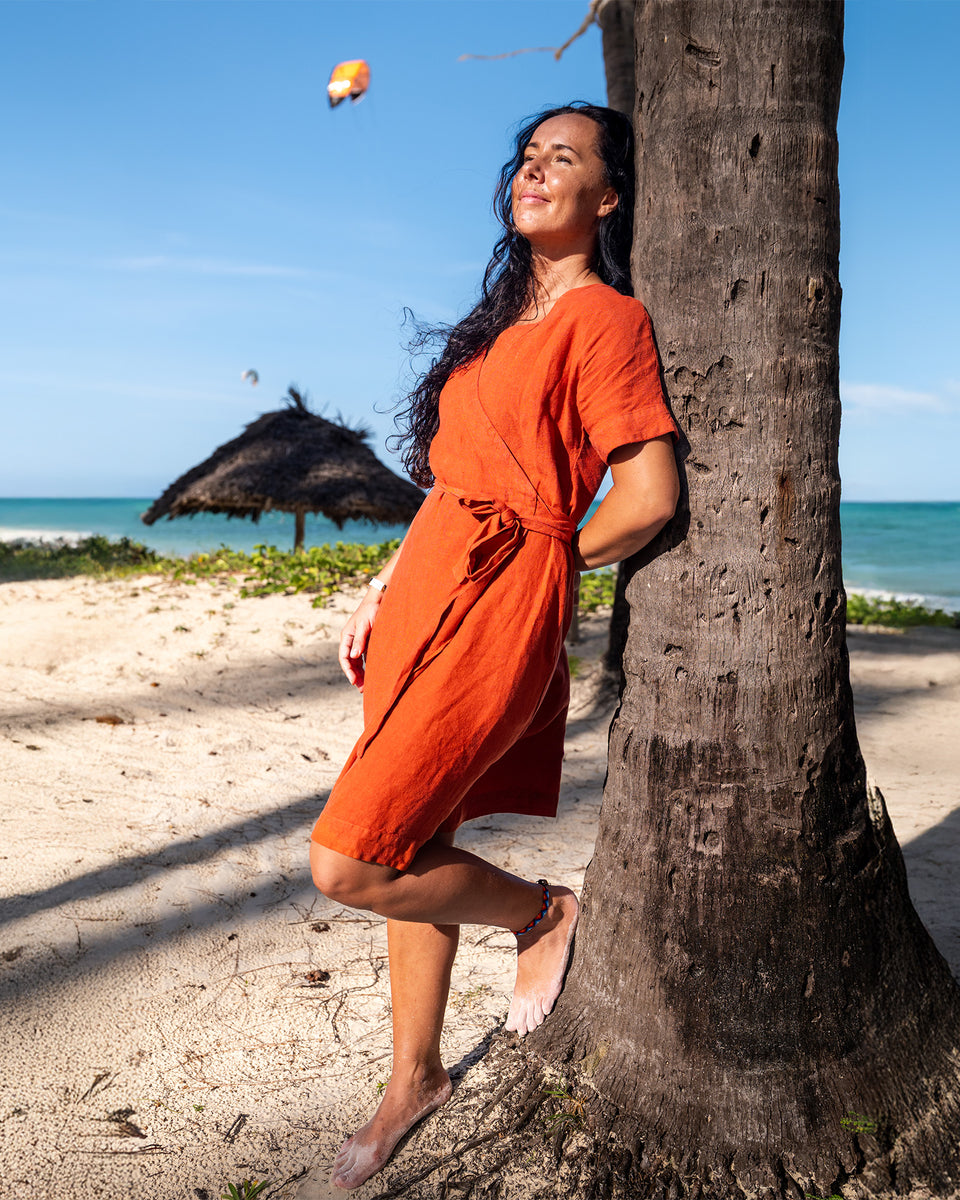 Ready for anything your summer adventures throw your way? Eliana is your versatile companion. This linen wrap dress is more than just beautiful; it's designed for the journey. Throw it over your swimsuit for a chic beach cover-up, tie it loosely for a relaxed daytime look while exploring hidden gems, or cinch the waist and add some delicate jewelry for an elegant evening ensemble. Crafted from breathable 100% linen, Eliana packs light and travels beautifully, making it the ultimate space-saving essential for your suitcase.