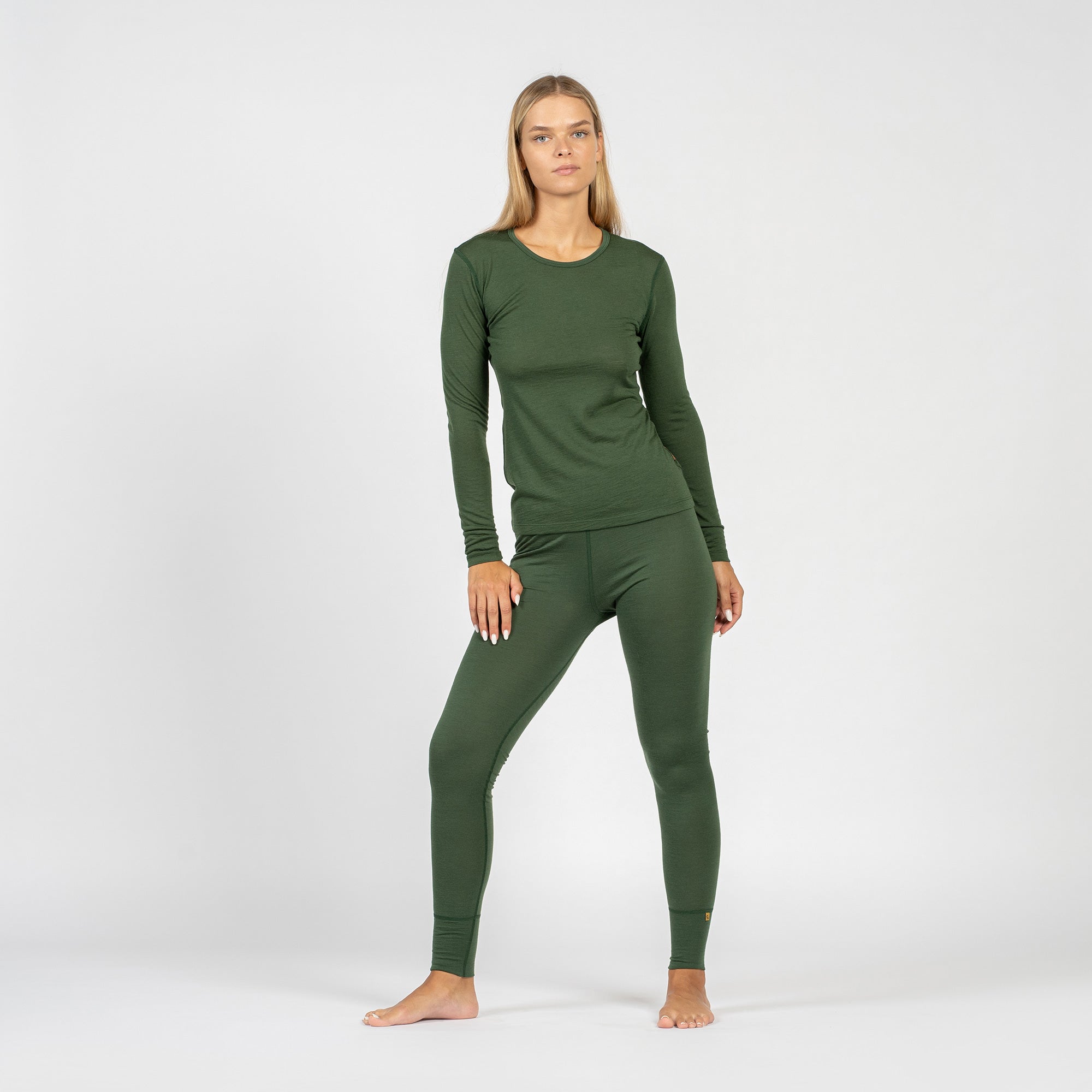 The menique women's merino wool dark green long sleeve top matched with menique dark green bottoms, from the front.